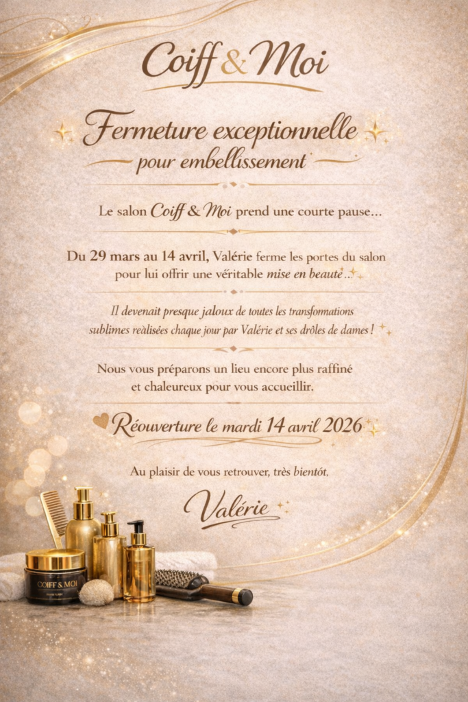 Fermeture exceptionnelle Coiff & Moi avec Style à Hyères : votre salon ferme temporairement pour se refaire une beauté. Ainsi, nous préparons un lieu encore plus élégant, chaleureux et agréable.